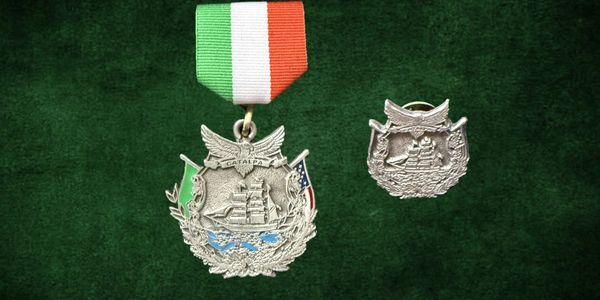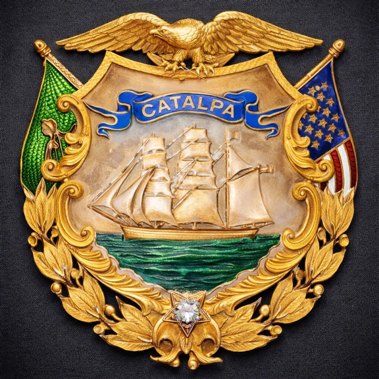 The medal features the Catalpa at its center, flanked on the right by a partially enameled American flag and on the left by a partially enameled Irish flag. An American eagle perches atop the shield-shaped medal. Just below the enameled green water on which the ship sits, there is a star with either a small diamond or glass inset. The bottom of the pin is decorated with a trio of gold leaves and berry patterns.